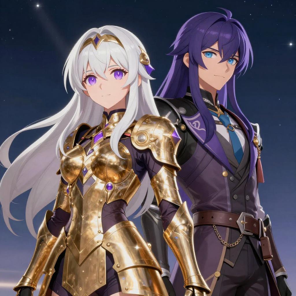 Digital anime-style illustration of a female character with long white hair and purple eyes wearing intricate gold armor standing beside a male character with long purple hair and blue eyes in a dark outfit. Both characters are set against a starry night sky with subtle light rays, showcasing detailed costumes and vibrant eye colors.