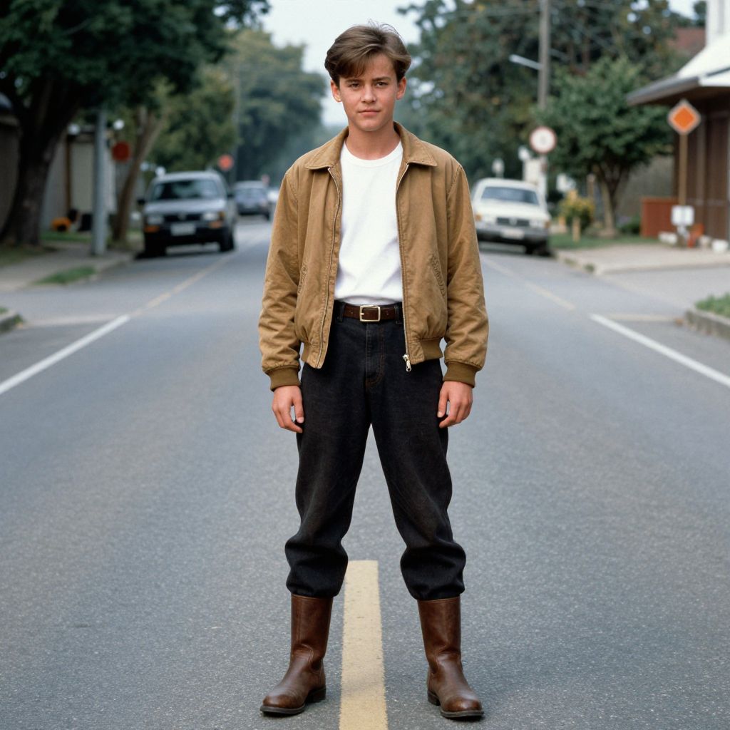 Photograph of a young white boy standing confidently in the middle of a suburban street. He has short, dark brown hair and a serious expression. He's wearing a white t-shirt under a light brown, slightly worn, military-style jacket, paired with black, cuffed trousers and brown, knee-high leather boots. The background shows a quiet street with parked cars, trees, and houses on either side, with a clear, blue sky overhead. The yellow centerline of the road runs directly beneath his feet. The overall style is casual and slightly vintage.