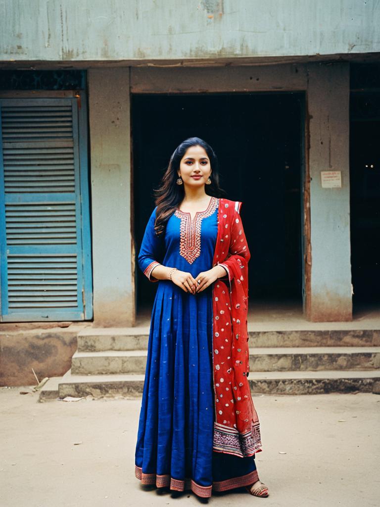Ladies Salwar Kameez, a woman in a red and blue dress standing in front of a building