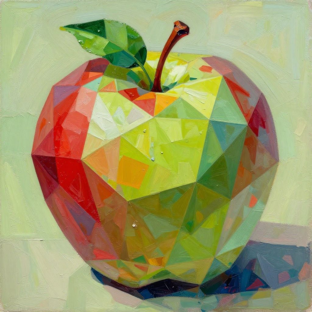 Cubism apple presented as a collage of angular fragments and polygonal shapes with vibrant hues of red and green, complete with intricate detailing and textured brushwork in an abstract expressionist style.