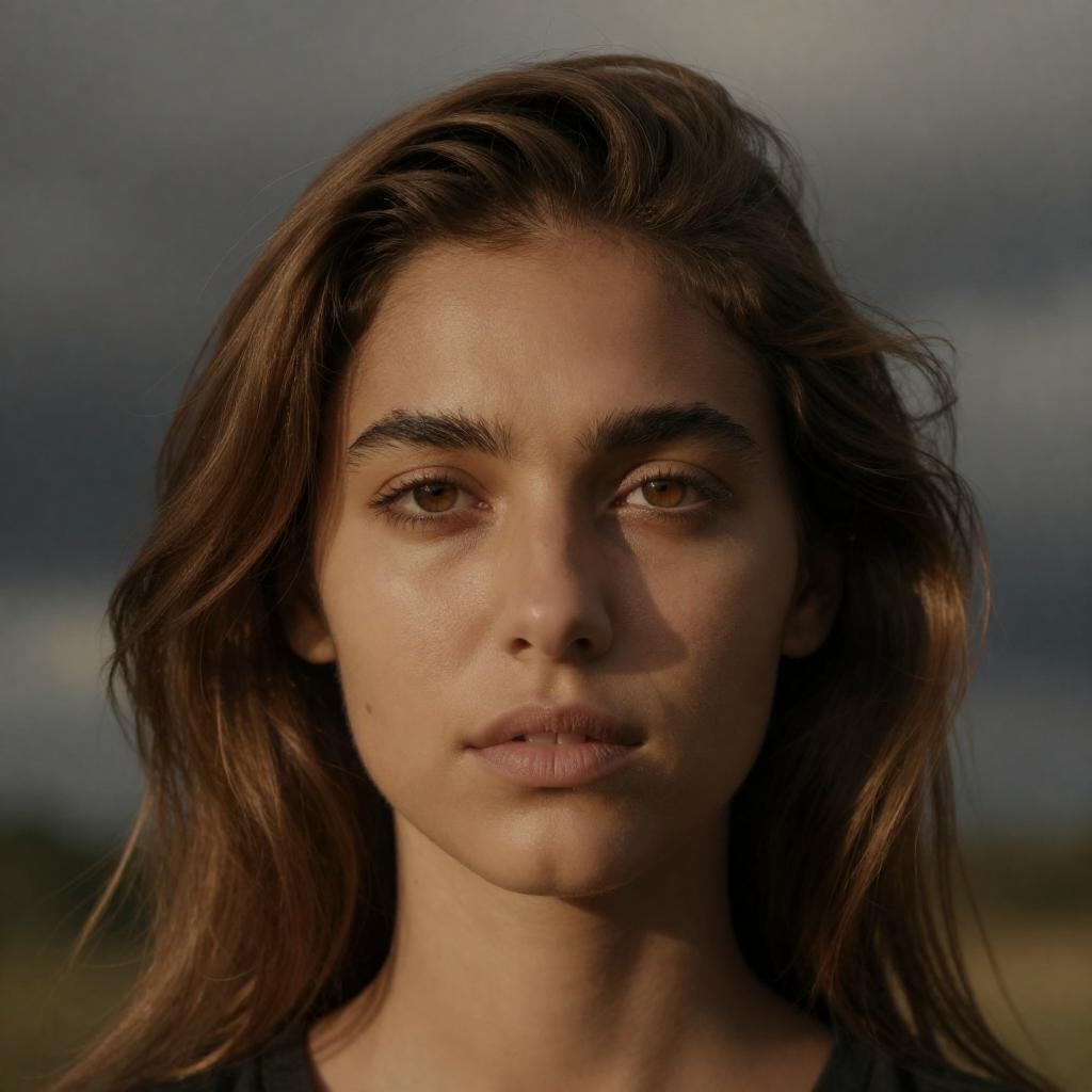 Photograph of a young woman with long, wavy brown hair, wearing a red jacket over a white shirt. She stands against a background of ured glass panes, with a neutral expression. The lighting is warm, casting shadows.