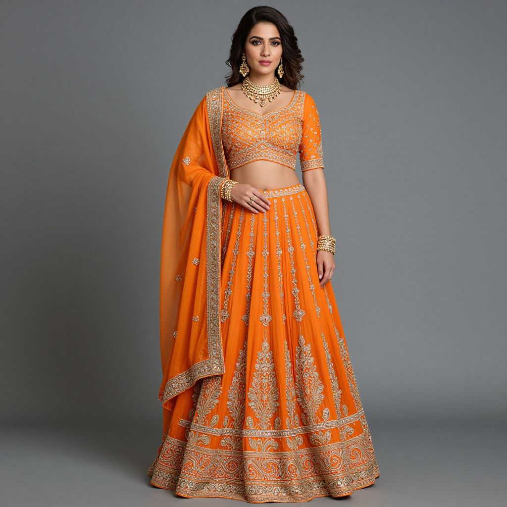 Woman wearing a vibrant orange georgette chikankari lehenga with intricate embellishments and a matching embroidered cape draped elegantly over her shoulders, complemented by gold jewelry and styled hair.