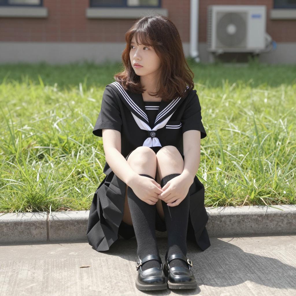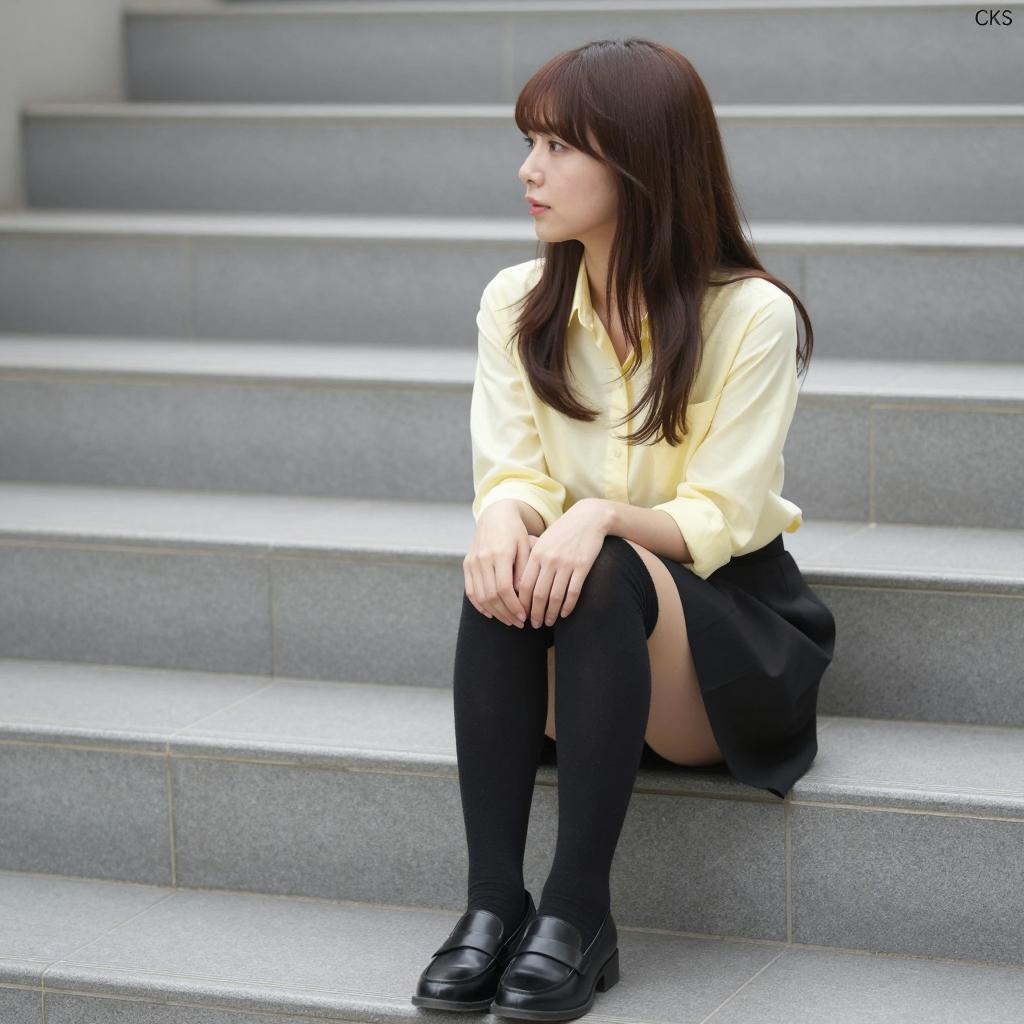 Japanese woman with long brown hair, wearing a light yellow shirt, black skirt, black thigh-high socks, and black shoes, sitting on gray tiled steps, looking to the left, hands resting on knees. CKS * JAPAN in top right.