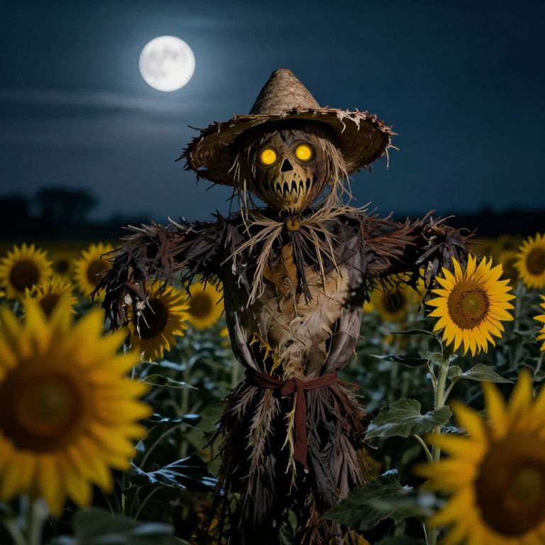 Scarecrow in a spooky nighttime scene, with glowing eyes and a worn straw hat, standing guard among tall sunflowers, the moonlight casting shadows that create an ominous yet captivating atmosphere in a mysterious countryside.