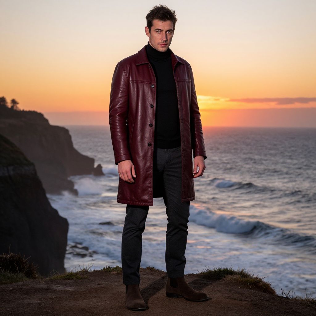 A man, burgundy leather overcoat, fitted black turtleneck, dark grey slim trousers, suede Chelsea boots, coastal cliffside, crashing waves below, vibrant sunset glow, pinhole camera style, contemplative expression. Man has masculine face and piercing eyes