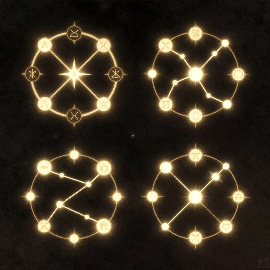 4 symbols of Chinese constellations, intricate traditional Chinese art style, glowing celestial symbols in a dark starry sky, delicate brush strokes, mystical and ancient atmosphere