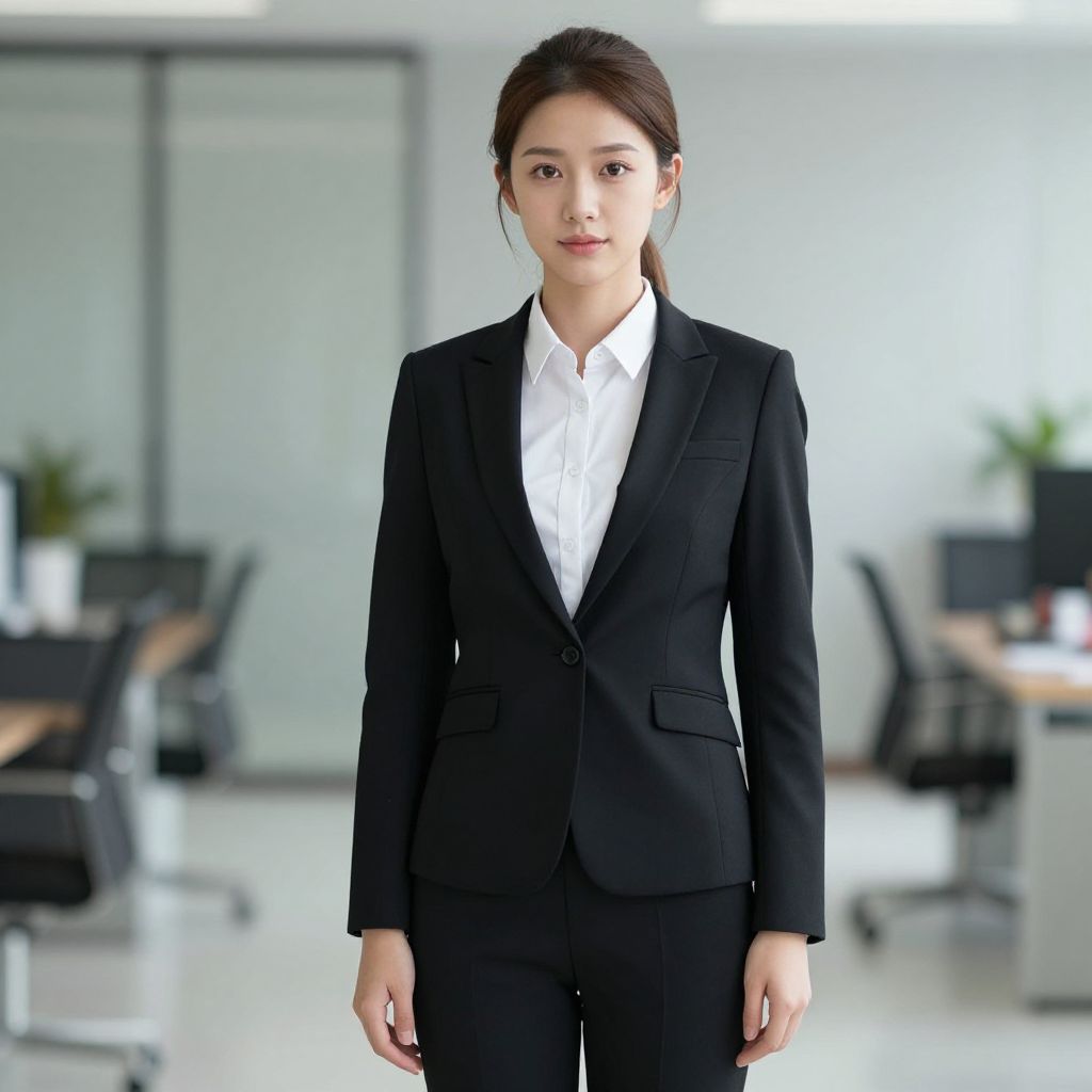 Photograph of a young Asian woman with fair skin and black hair in a neat bun, wearing a black suit with a white shirt, standing in a