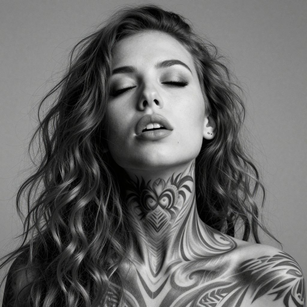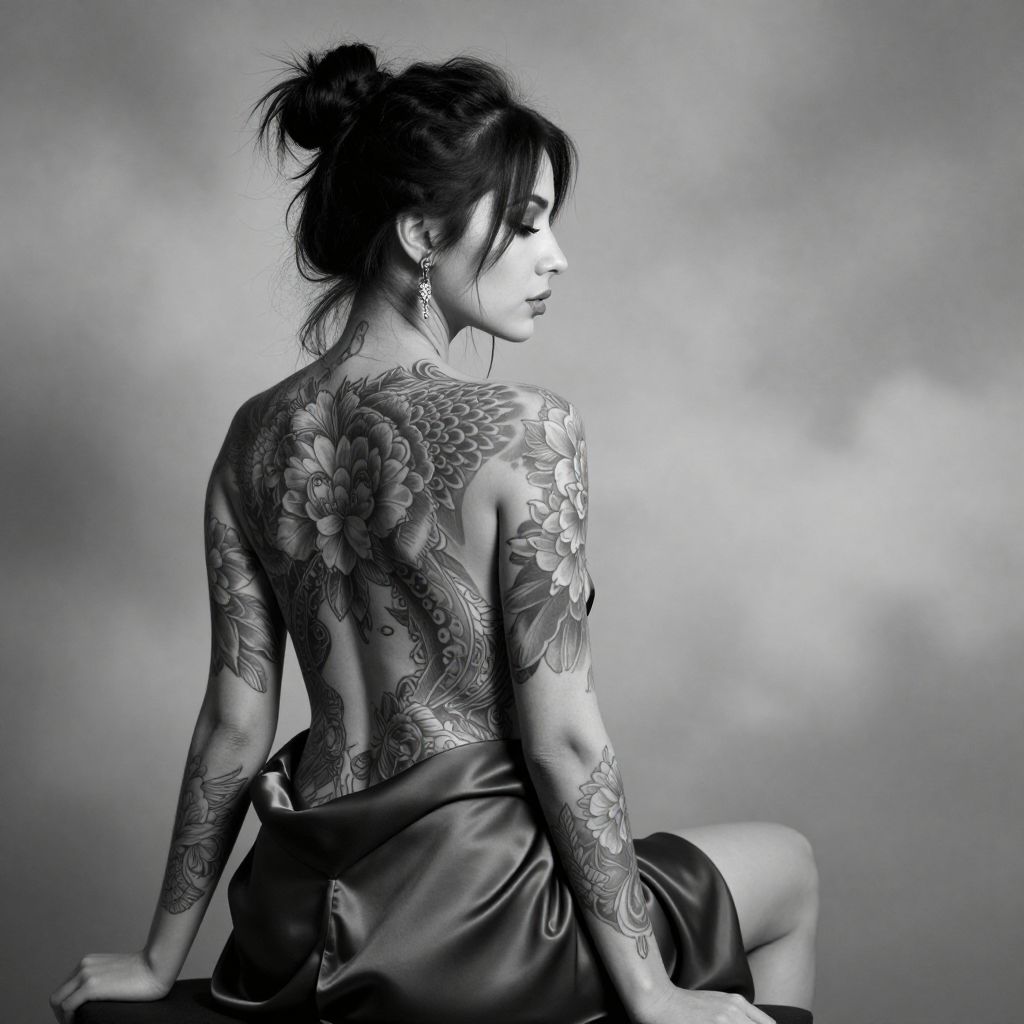 Black-and-white photograph of a young woman with long, dark hair, facing left. She has intricate floral tattoos covering her hands and right shoulder. Her fingers are pressed together in a praying gesture, with long, black-painted nails. Her expression is serene, and the background is a smooth gradient of gray. The image has a high-contrast, moody vibe.