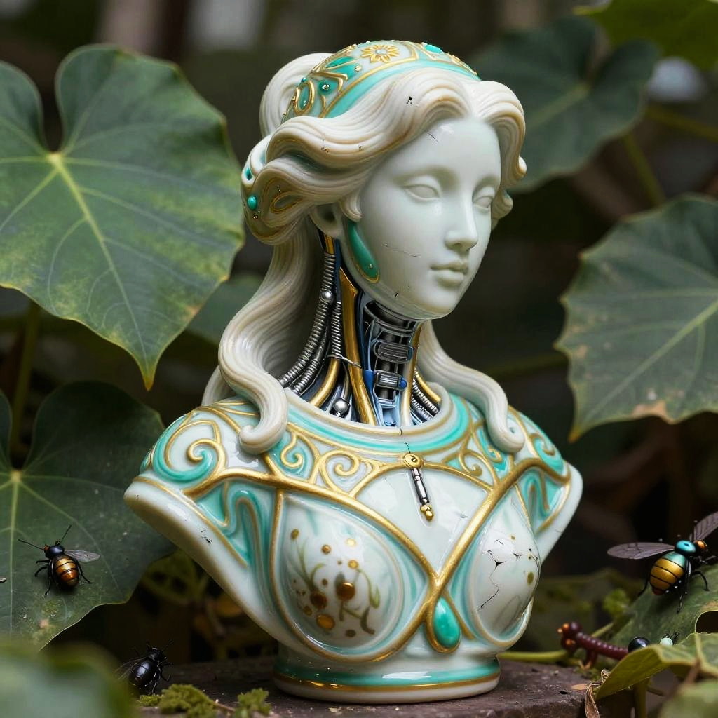 Realistic photo.Cinema 4D colorful render of a painted realistic porcelain woman’s bust, scratched biomechanical cyborg elements, natural soft rim light, surrounded by big leaves and insects, turquoise gold details, inspired by Fendi, Art Nouveau fashion, intricate mesh wires, ultra-detailed, 8k post-production realistic photo