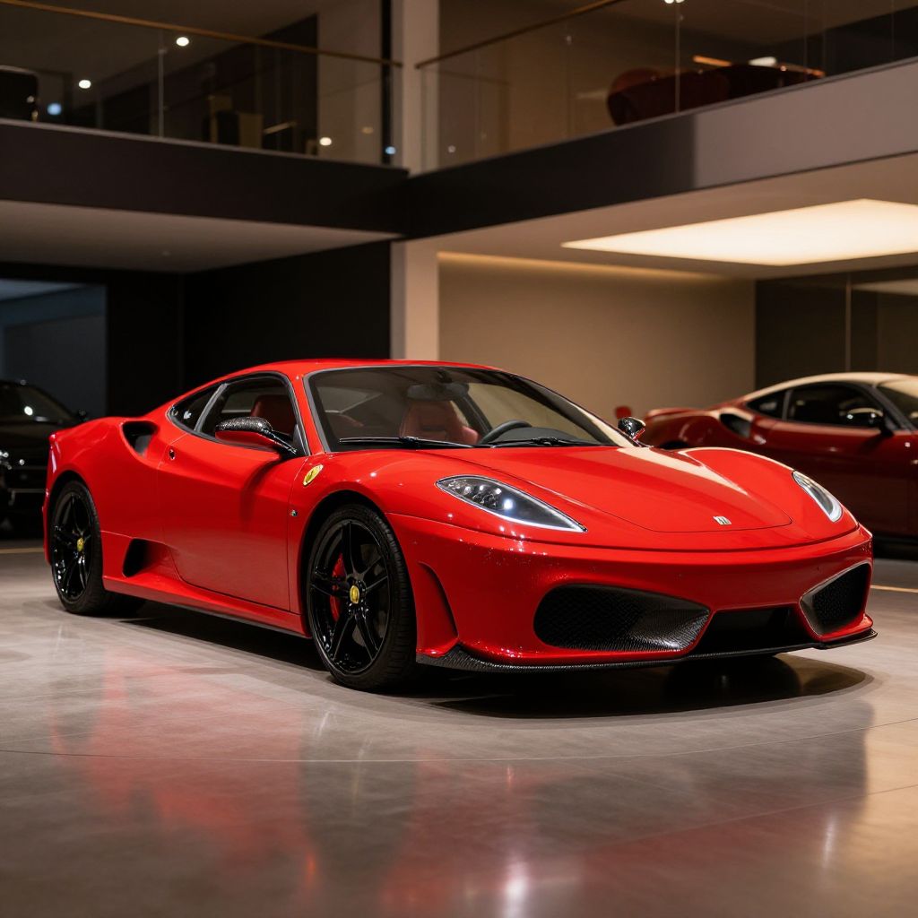 F430 displayed in a luxury garage, pristine red paint glowing under soft ambient light, polished floor reflecting the car, modern architecture with glass and steel elements, detailed textures of leather seats and carbon fiber parts, elegant and sophisticated atmosphere.