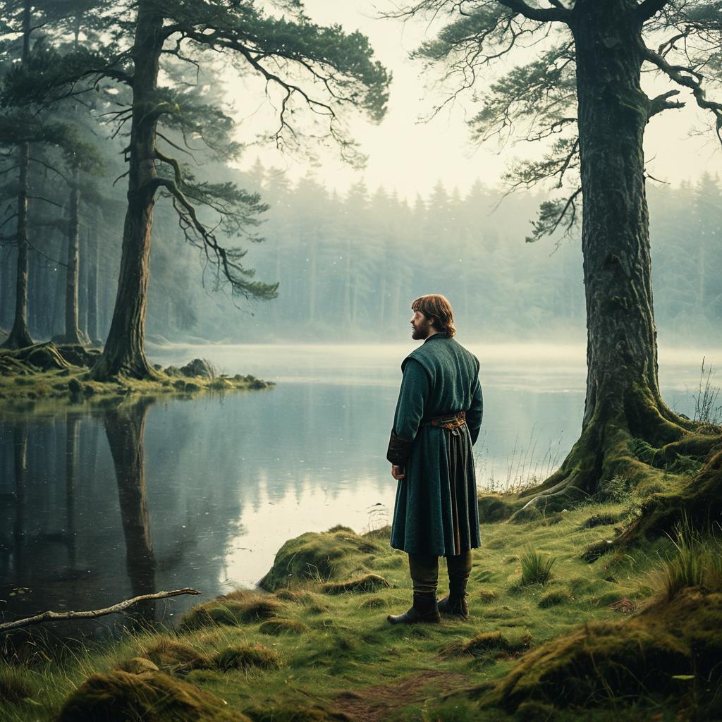 A serene man dressed in traditional ancient Celtic attire stands by a mist-covered lake in a lush forest glade. Moss-covered rocks and towering old trees surround the calm water, creating a tranquil atmosphere reminiscent of Celtic mythology. The image features soft, diffused lighting and a warm color palette, evoking a sense of peace and natural beauty.