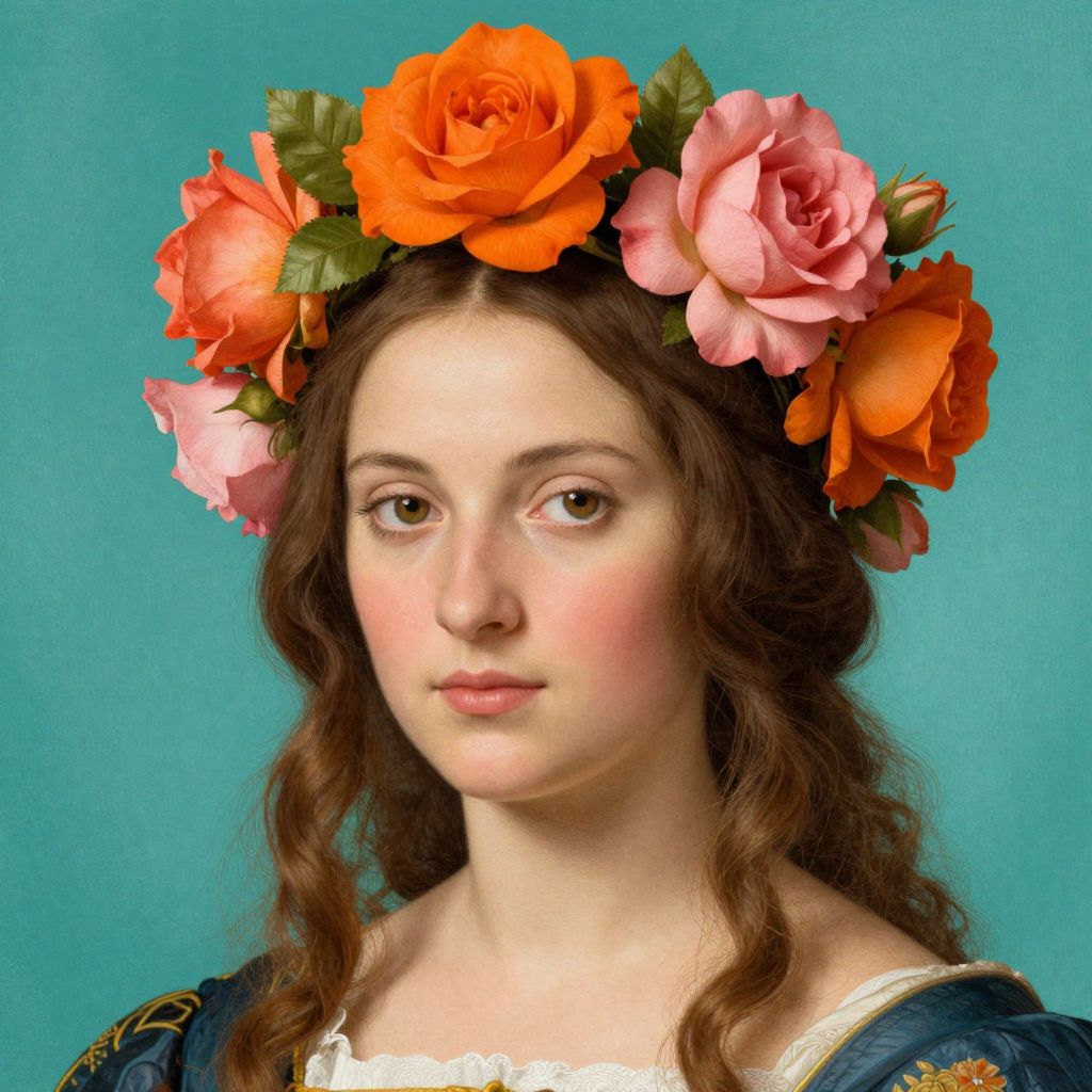 A vibrant digital illustration inspired by Renaissance portraiture, featuring a woman adorned with a floral crown of vivid orange and pink roses against a teal background, rendered in high-definition detail reminiscent of Ian Pettigrew's style.