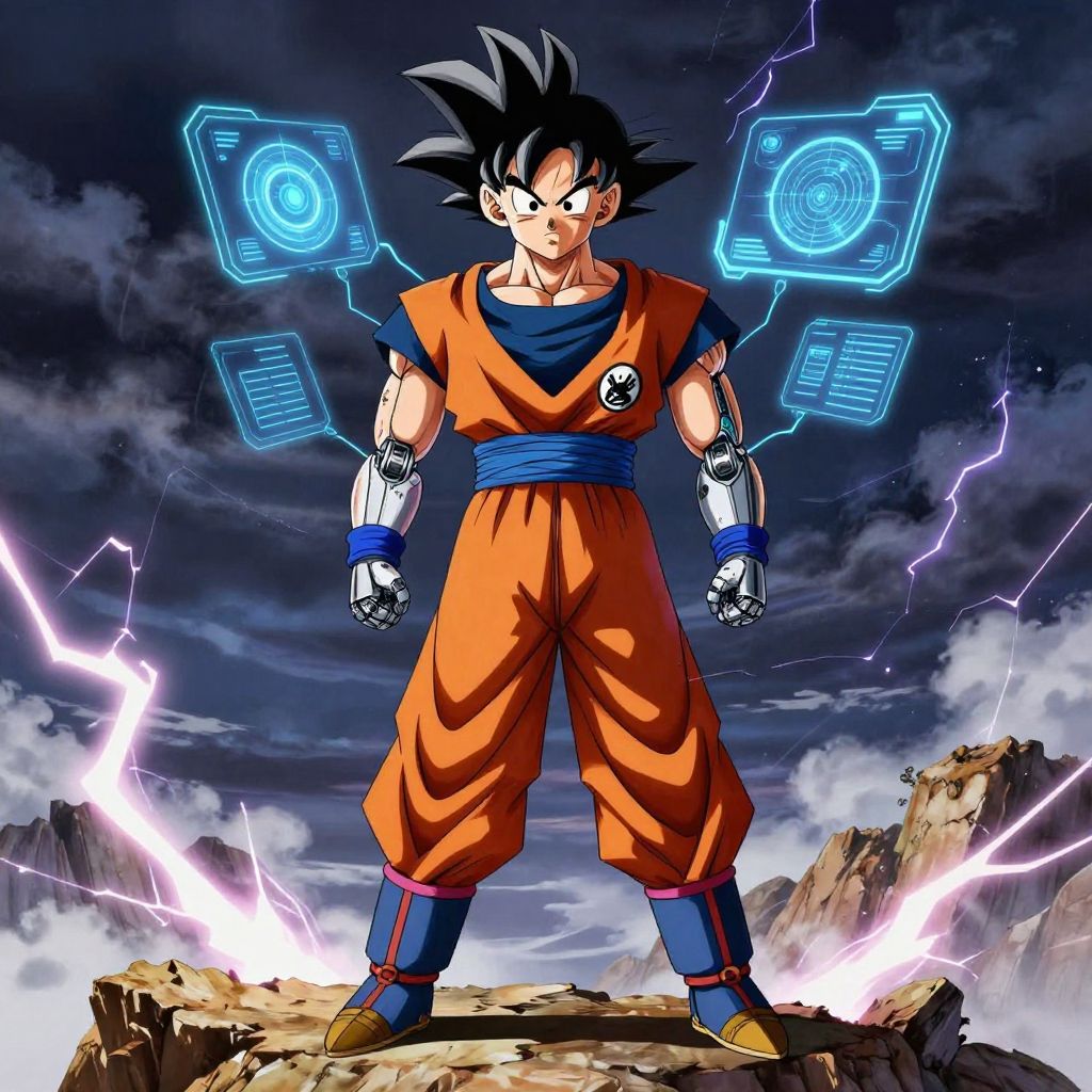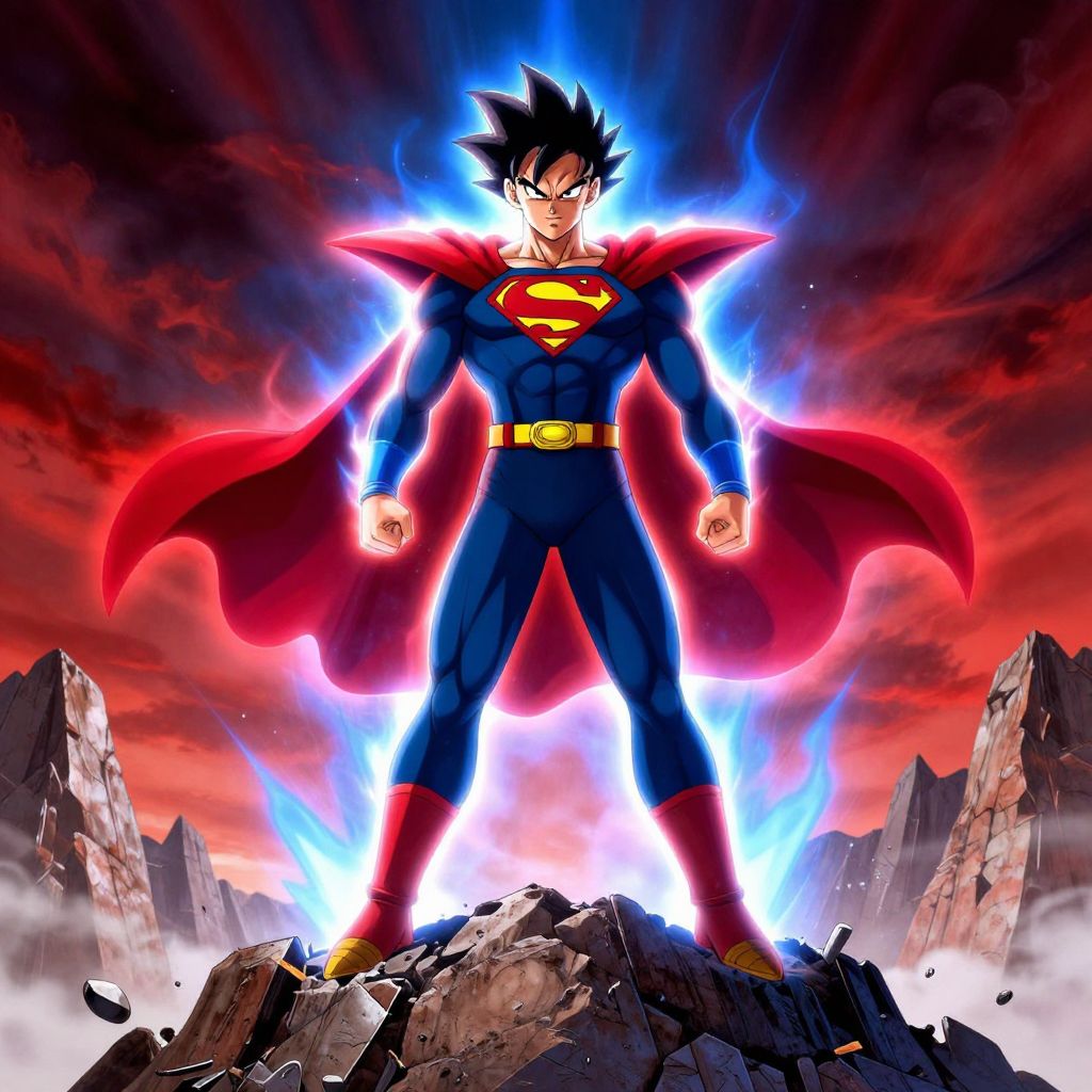 Goku Superman fusion character standing heroically on a shattered mountain peak, combining Saiyan armor and Superman's cape, glowing with blue and red energy aura, dynamic anime and comic book style with dramatic lighting and intense sky background