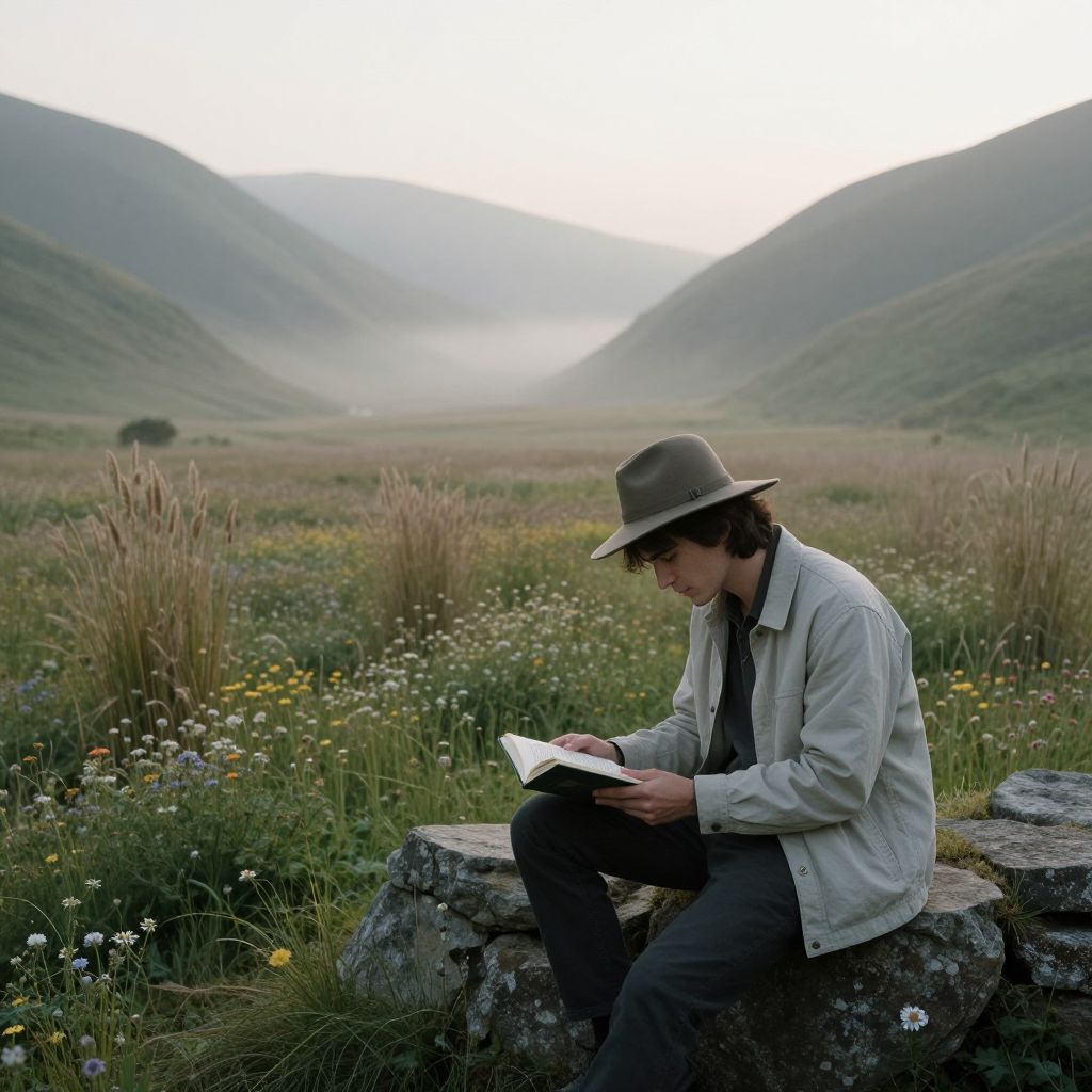 A misty field setting at sunrise in a mountain valley, with rolling hills covered in wildflowers and patches of tall reeds. A thoughtful young man with dark brown hair and a focused expression sits on a low stone wall, reading a book under a wide-brimmed hat and a light jacket.