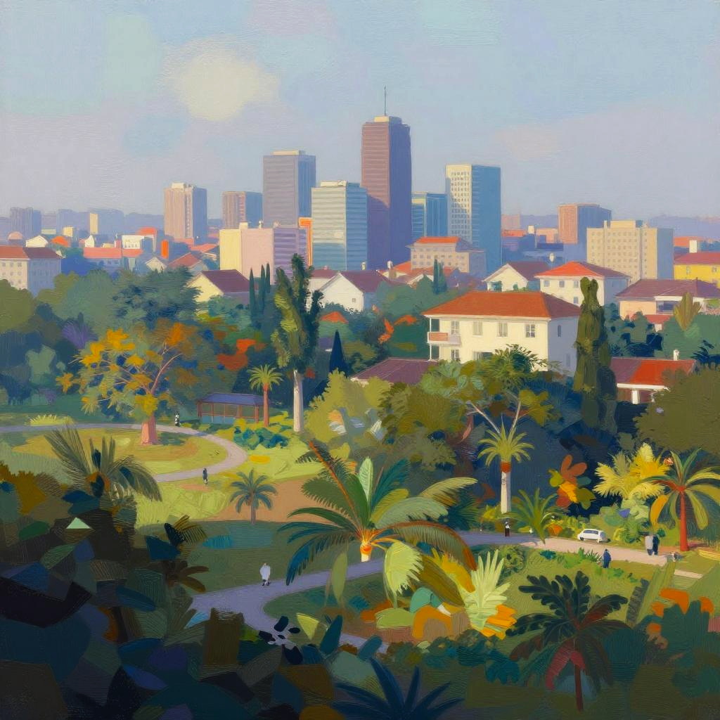 This digital painting in a vibrant, pixelated style depicts a suburban landscape with a city skyline in the background. The foreground features lush greenery with palm trees and various shrubs, bathed in sunlight. A winding path is visible, leading through the garden. Mid-ground includes a beige, red-roofed house with tall cypress trees nearby. The background showcases a cluster of tall, modern skyscrapers in shades of blue, gray, and beige, contrasting with the suburban area. The sky is bright blue with a few scattered clouds. The overall composition combines urban and natural elements, emphasizing a harmonious blend between city and nature.