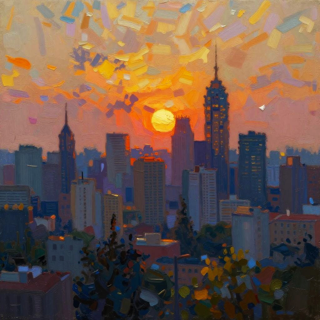 Blend two pictures seamlessly into a surreal landscape, combining cityscape with nature elements, vibrant colors, smooth transitions, soft lighting, and artistic brushstroke textures, creating a dreamlike atmosphere and harmonious composition.