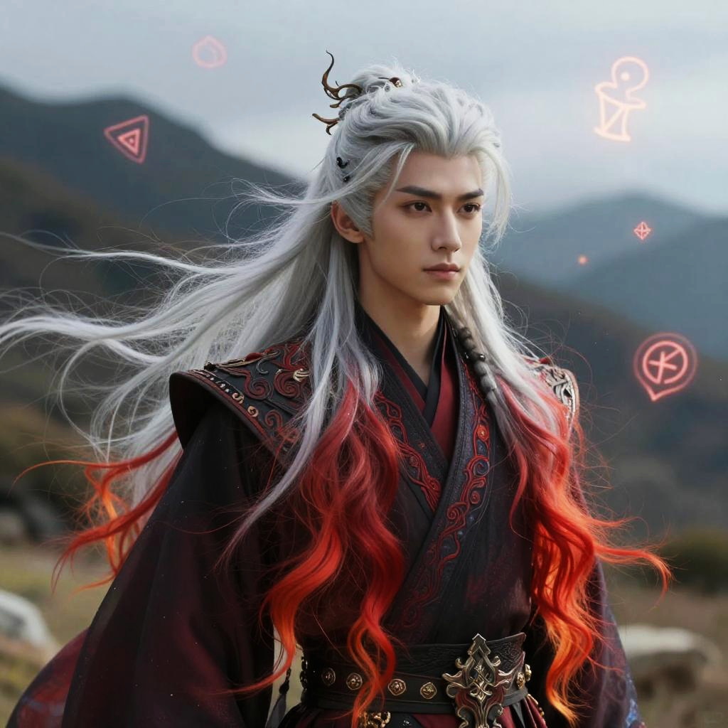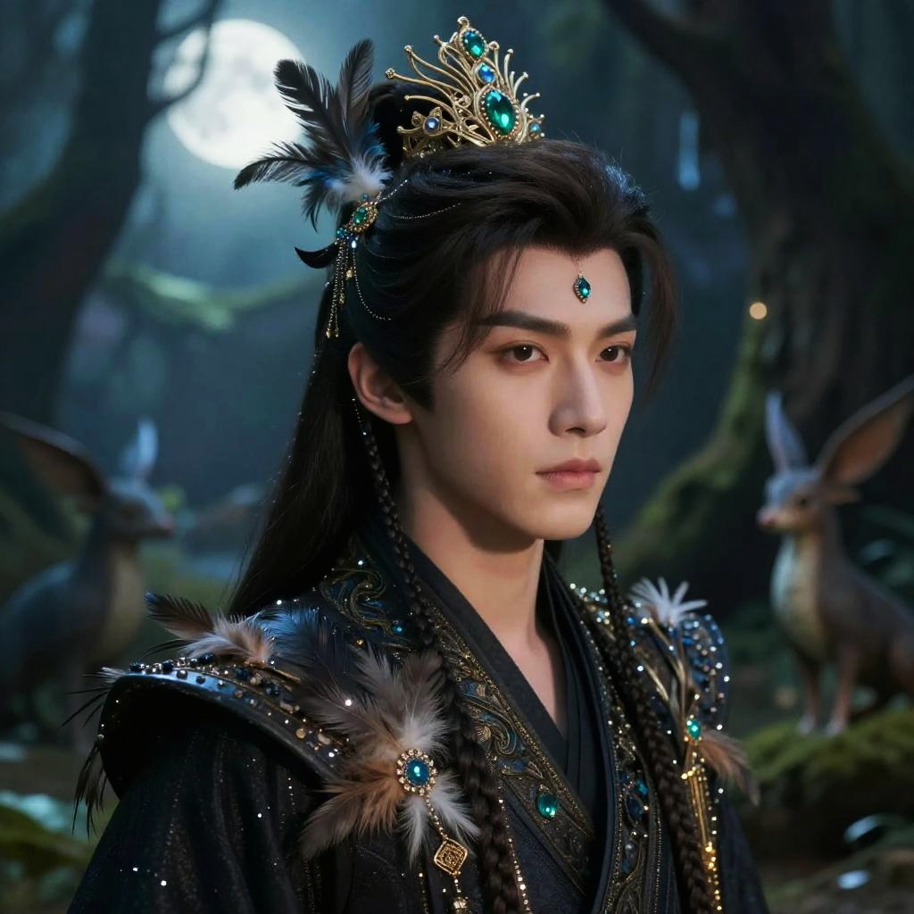 Fantasy male hairstyles decorated with feathers and gemstones, illuminated by a soft moonlight in an enchanted woodland filled with mythical creatures.