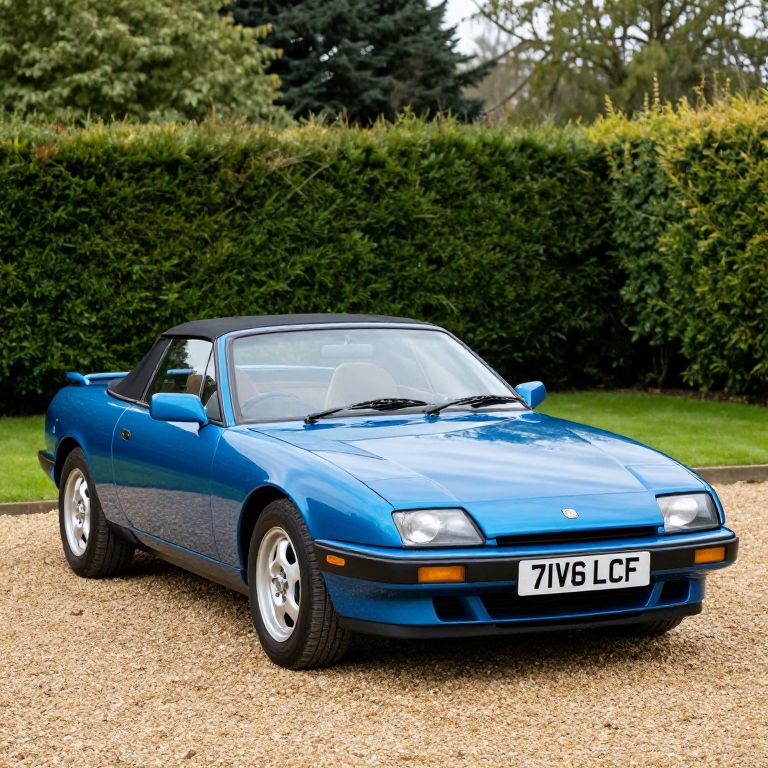Shiny blue TVR Griffith 5.0 LHD (1993) parked on a gravel driveway, showcasing its classic design with a convertible top, dual side mirrors, and license plate reading \"7IV6 LCF,\" set against a backdrop of manicured green hedges and trees.