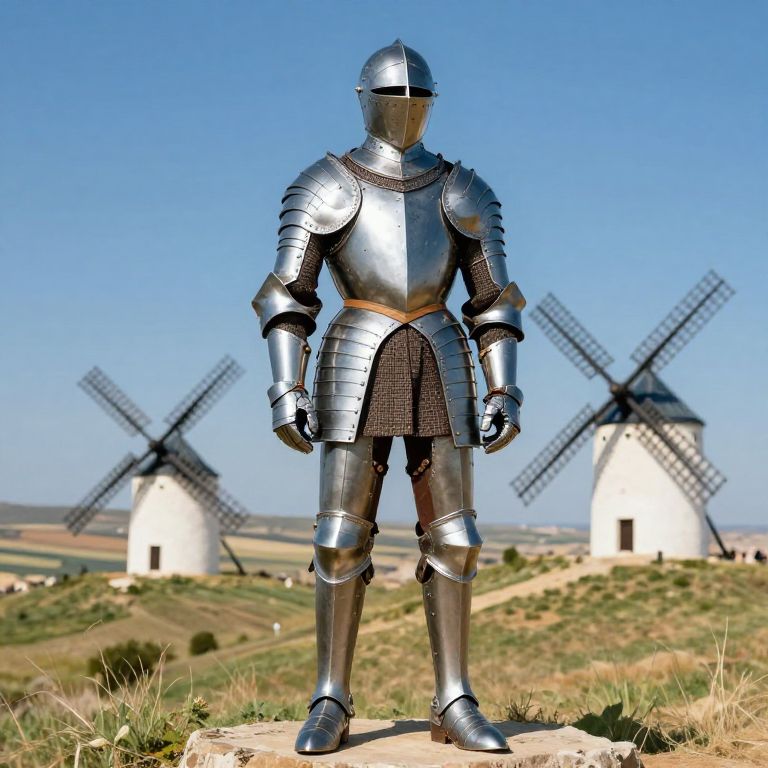 Don Quixote armor full suit on a tall, slender figure, detailed classical Spanish renaissance design, set against vast rolling hills and old windmills, vibrant colors