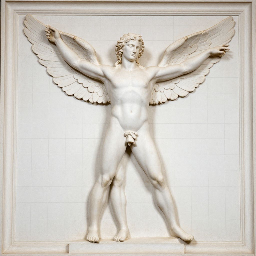 Photograph of a white marble relief sculpture depicting a nude, male, angelic figure with outstretched wings and curly hair. The angel stands with legs slightly apart, arms raised, and wings fully extended. The sculpture is detailed with realistic feather textures on the wings and a visible, proportionate, uncircumcised penis. The background is a grid of white tiles, and the sculpture is framed by a simple, white, rectangular border. The overall style is classical, reminiscent of Renaissance art. The lighting is bright, highlighting the smooth, polished texture of the marble.