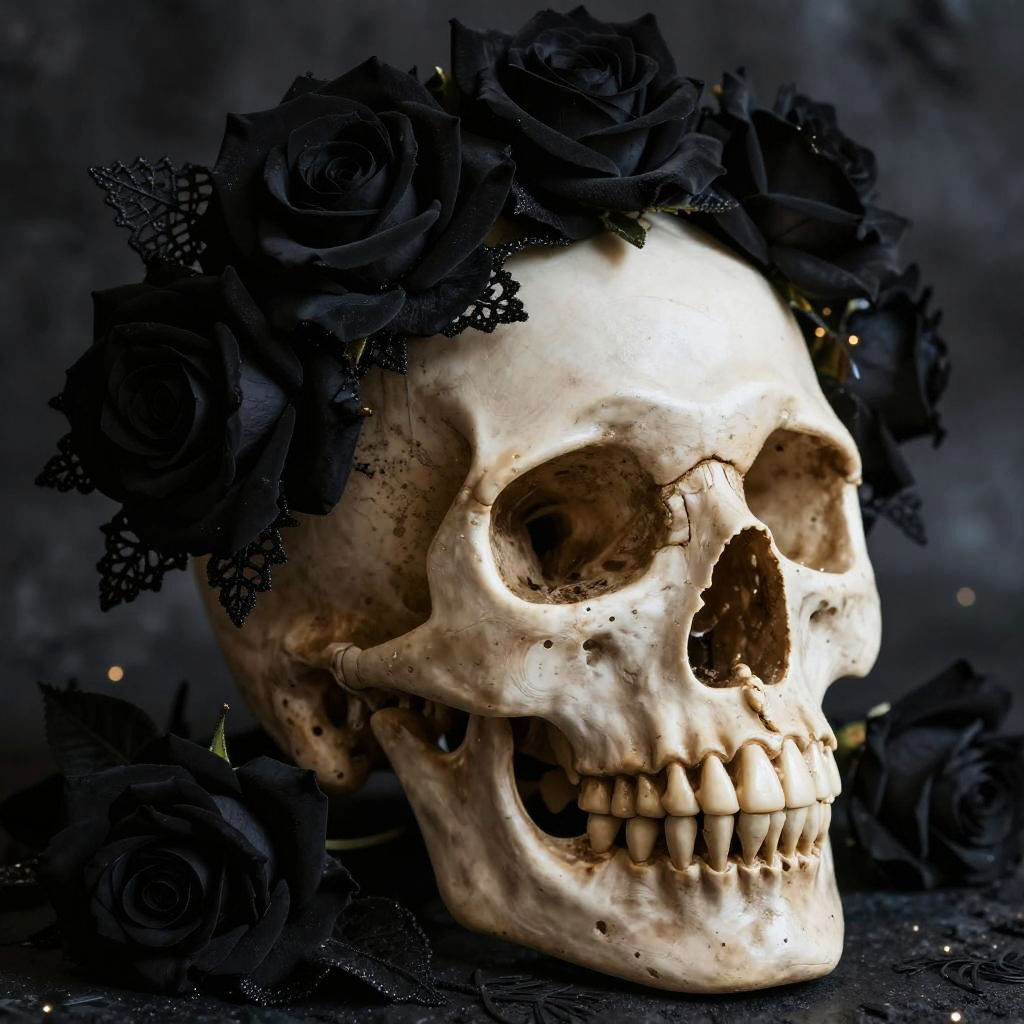 Close-up goth filter image of a skull adorned with black roses and intricate lace patterns, set against a textured charcoal background with subtle glowing elements, evoking a haunting beauty and elegant morbidity.