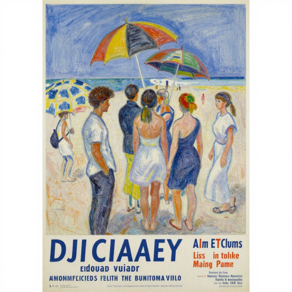 A gauguinesque, pedestrian painting of a bunch of people on the beach with umbrellas by edouard vuillard, flickr, synthetism, childs drawing, impressionism, concert poster