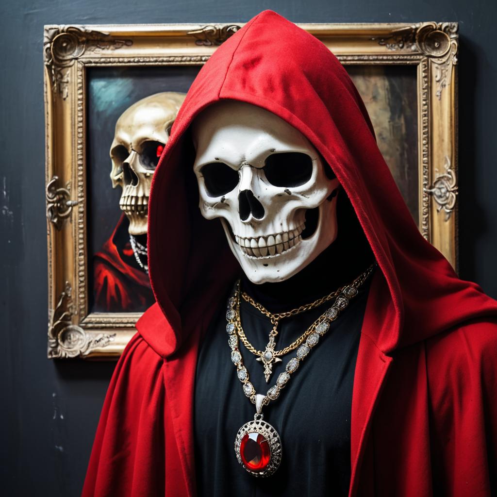 Hood, solo, cloak, jewelry, hood up, no humans, skull, hooded cloak, red cloak, mask, hollow eyes, necklace, indoors, male focus, painting (object), gem, horror (theme), upper body, pendant, 1other, brooch, picture frame