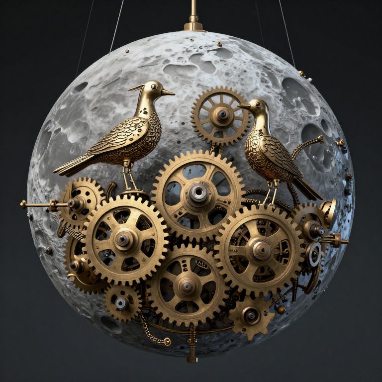 Clockwork birds nest in the gears of a suspended industrial moon, their mechanical songs syncing with the heartbeat of forgotten machinery.