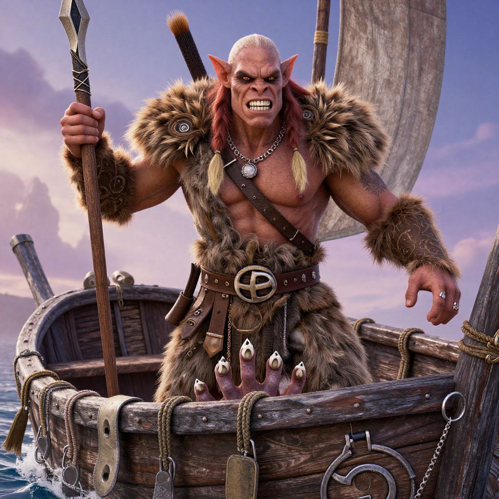 "Atmospheric half-orc barbarian Disney princess covered in the human teeth and fingers of her enemies, boat paraphernalia,"