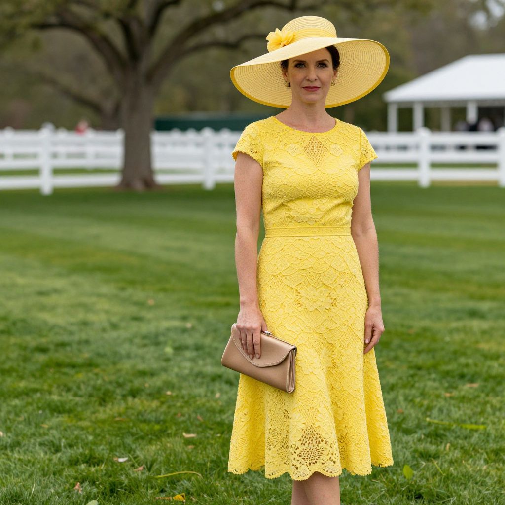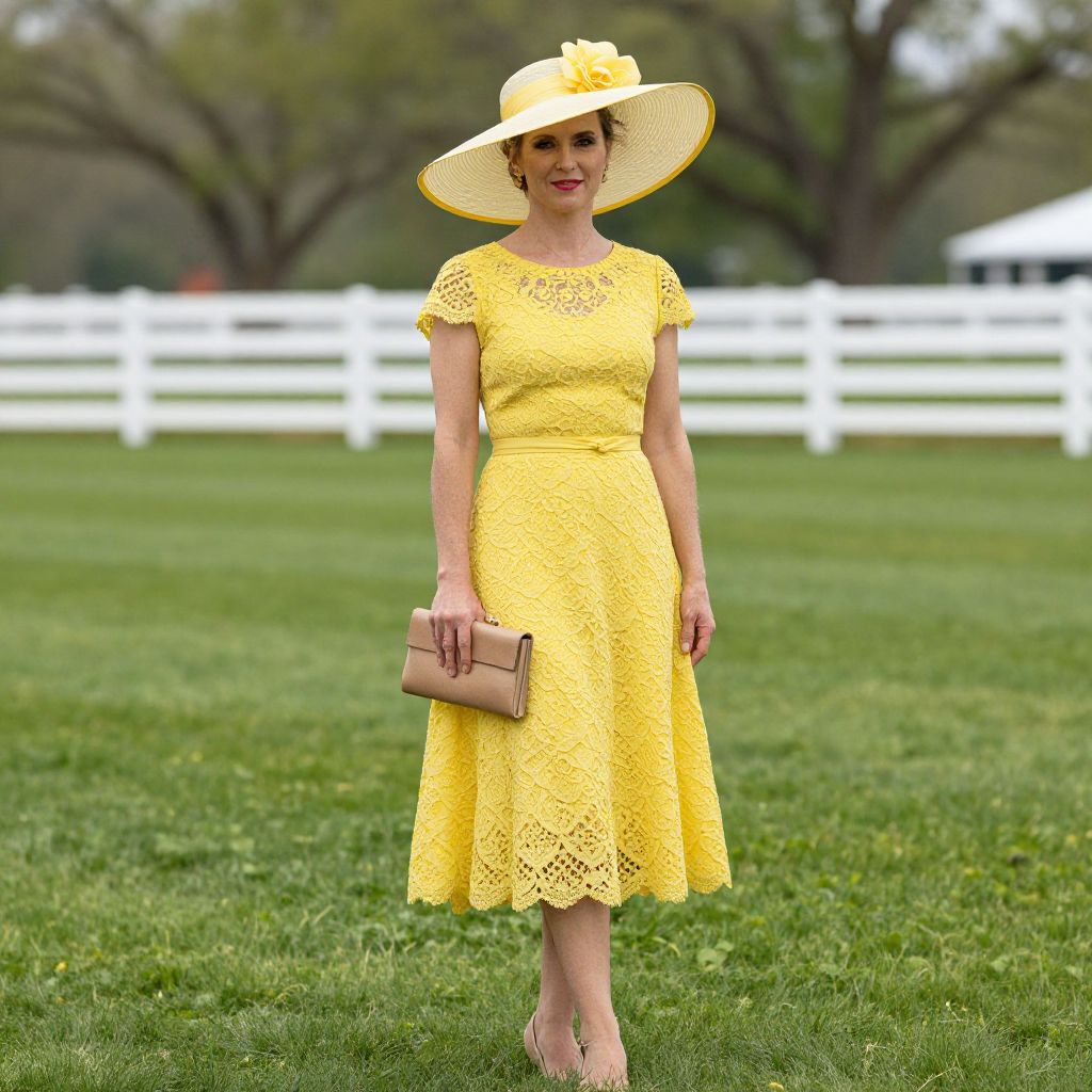 Woman wearing a vibrant yellow lace dress and matching wide-brimmed hat stands gracefully outdoors, holding a tan clutch purse while surrounded by lush green grass, white fences, and trees in a serene Kentucky Derby-inspired setting.