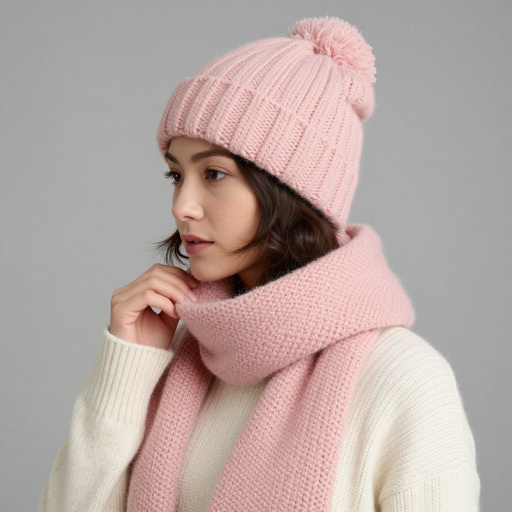 Woman wearing a cozy pink knitted winter hat and scarf set, paired with a cream ribbed sweater, exuding warmth and style against a neutral background.