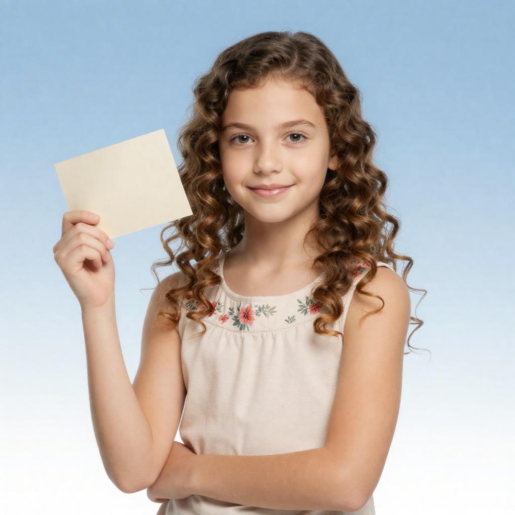 Black and white photograph of a young girl with curly blonde hair, wearing a frilled blouse, smiling while looking to the right. She stands next to a vintage microphone with the letters "FBC" on it. Background is a simple, ured wall.