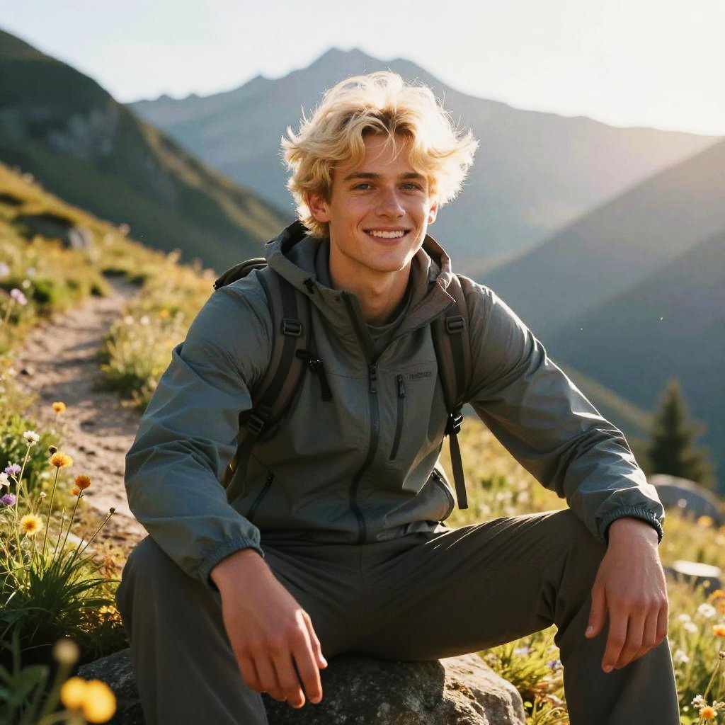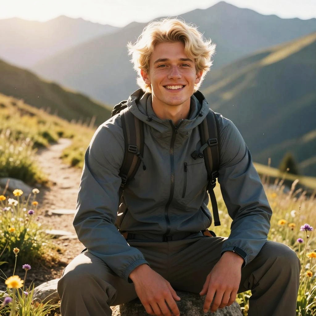 (masterpiece:1.1), best quality, (photorealistic:1.2), hyperrealistic, award-winning portrait of young man, platinum blonde hair styled in a quiff, smiling, upper body, expressive eyes, slim wai BREAK 1.1, wide hips:1.1, athletic-curvy build, wind-swept hair, sitting in sunlit mountain trail with wildflowers, wearing athletic jacket and hiking pants, golden hour glow, dappled light, soft particles in the air, 8k, highly detailed, broad lighting, chromatic aberration, subtle film grain, ray tracing, octane render, soft bloom