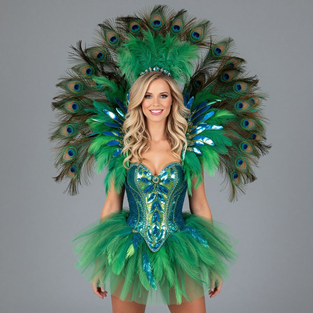 Blonde woman wearing a vibrant peacock feather bustle tutu costume, featuring cascading green feathers and eye-catching blue iridescent patterns, perfect for Halloween, costume parties, or Mardi Gras celebrations.