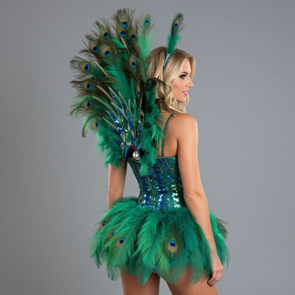 Photograph of a blonde woman with wavy hair, seen from behind, wearing a sparkling blue sequin bodice and a short, green peacock-feathered skirt. The skirt features large, vibrant peacock feathers with blue and green iridescent eyespots. Her skin is fair, and she has a slender build. The background is a plain, light gray studio wall. She is smiling and looking to her right. The overall style is glamorous and festive, reminiscent of a peacock-themed costume.