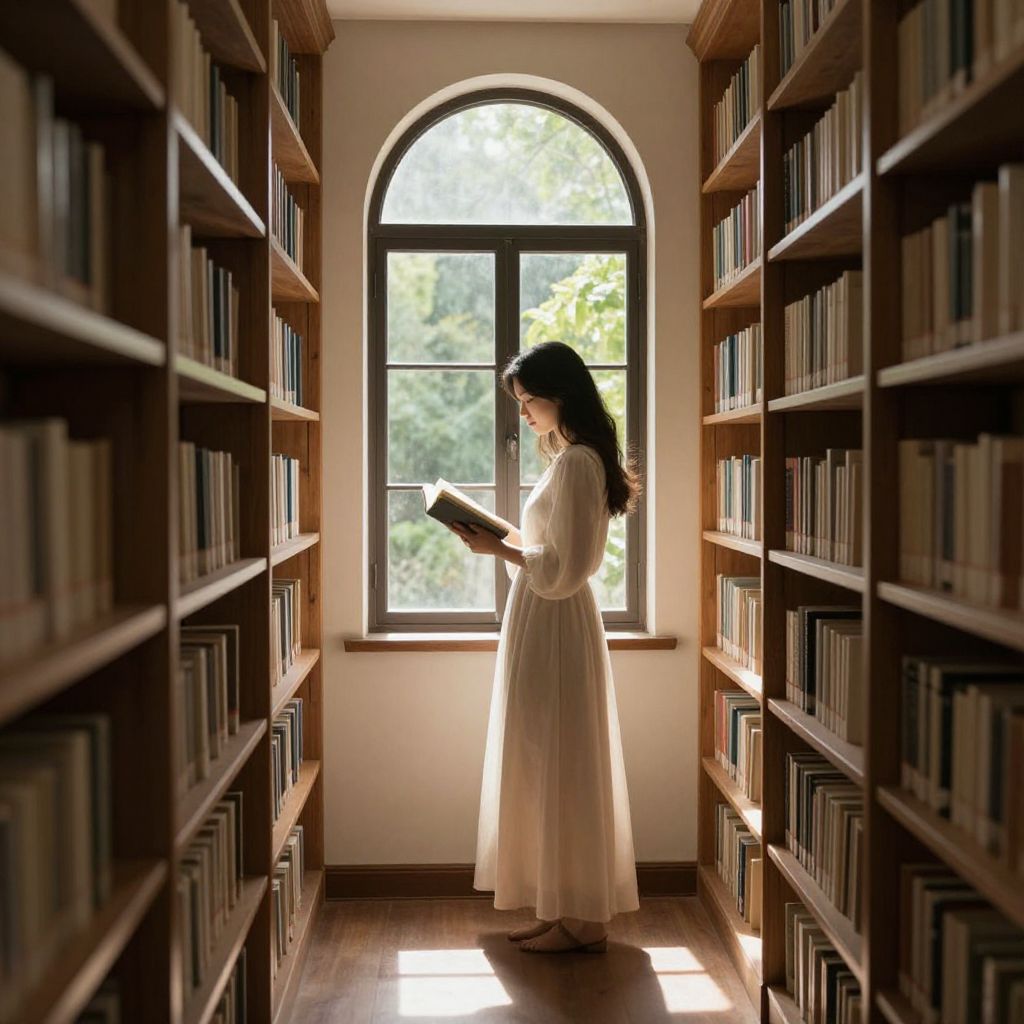 Photograph of a slender woman with long black hair, wearing a flowing, white, long-sleeved dress, standing in the center of a narrow library aisle. She is holding an open book, gazing down at it. The aisle is flanked by tall, wooden bookshelves filled with books, leading to a large, arched window at the back, allowing sunlight to pour in. The window reveals a green, tree-filled outdoor scene. The floor is wooden, and the walls are white. The image has a warm, soft light, creating a serene and contemplative atmosphere.