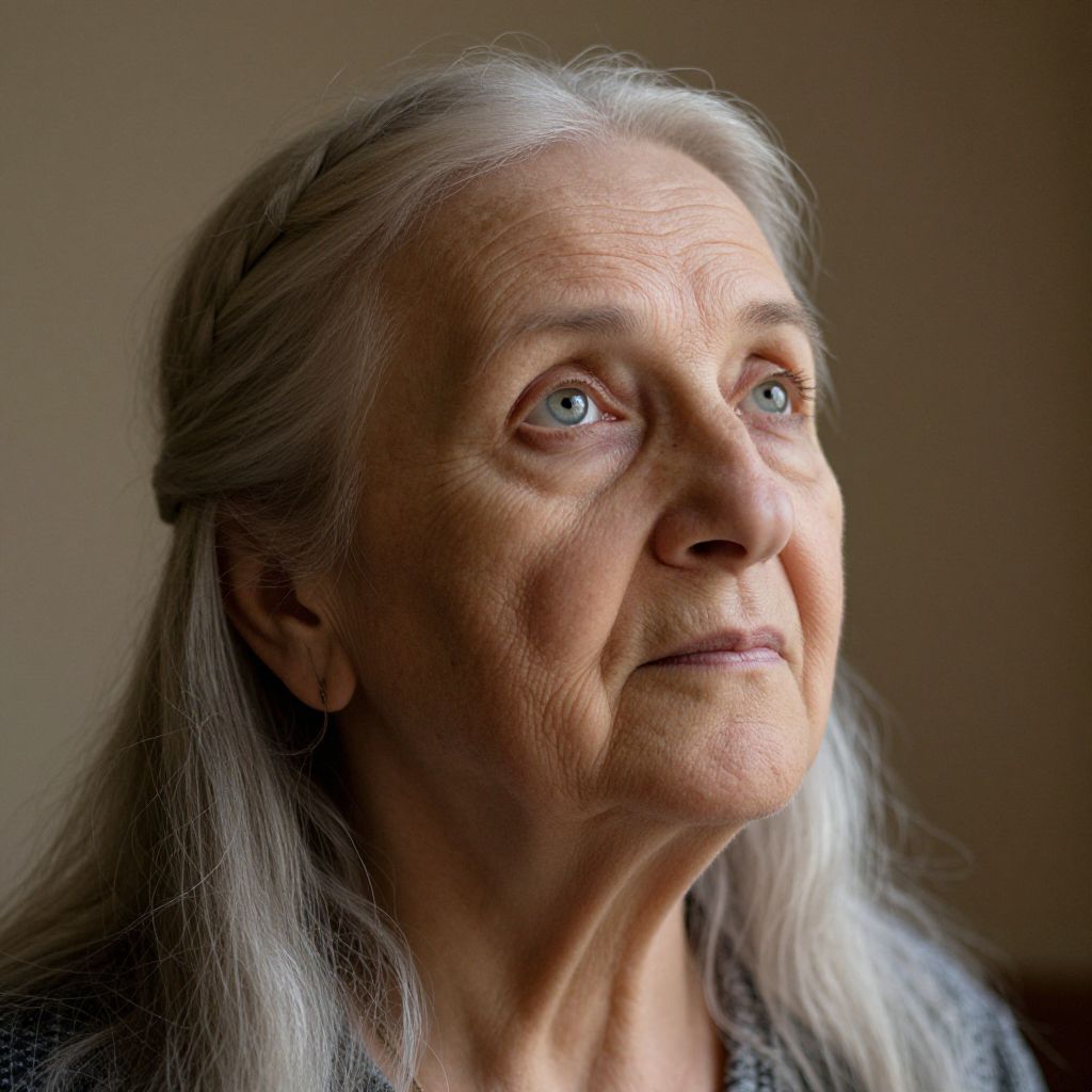 Photograph of an elderly woman with long, silver hair, light blue eyes, and wrinkled skin, gazing thoughtfully upwards; soft, natural