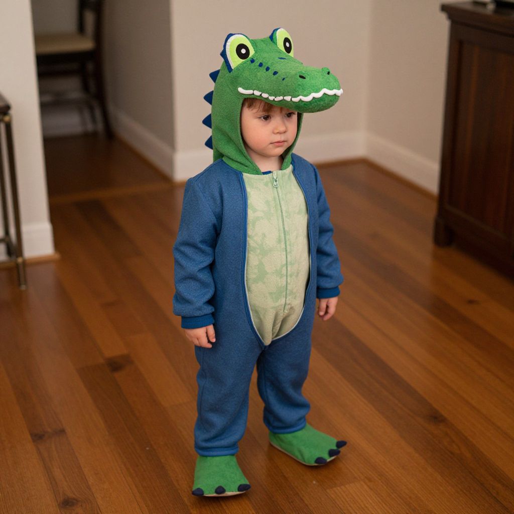 Kid Alligator Costume, small child standing on a wooden floor wearing a hat and jacket
