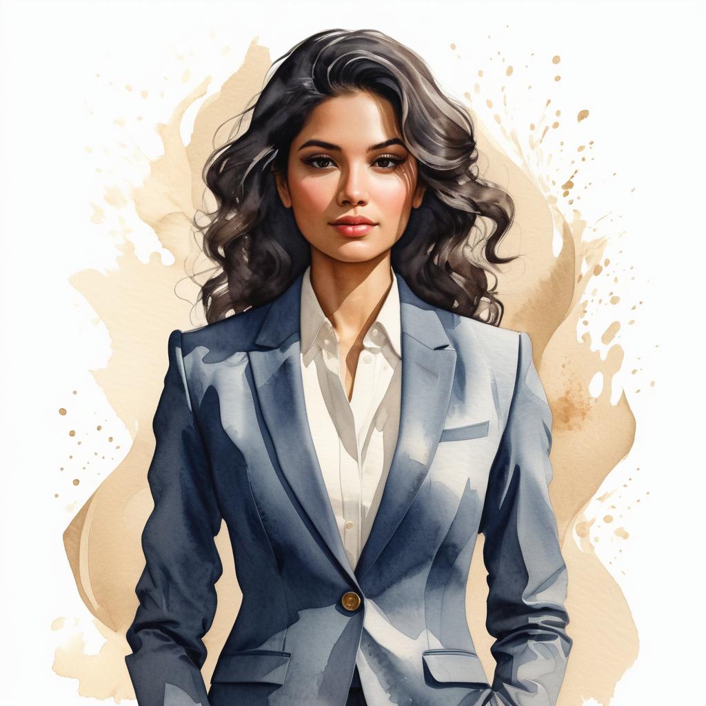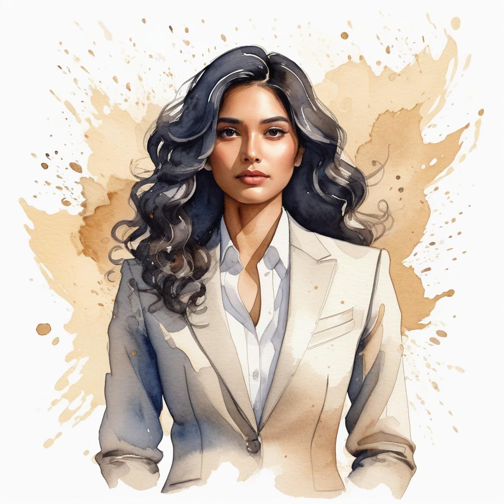 A digital watercolor portrait of a confident woman with long wavy black hair, wearing a beige blazer over a white shirt. The background features light beige and tan splashes, enhancing the artistic effect. The woman exudes professionalism and poise.