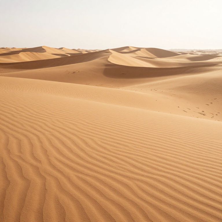 Photograph of a vast, sunlit desert landscape with rippled sand dunes. The image showcases a series of parallel, wavy sand ridges in the foreground, leading to undulating dunes in the background. The sand is a warm, golden-orange color, and the sunlight casts soft shadows, emphasizing the texture and depth of the dunes. The sky above is bright white, contrasting with the warm hues of the sand. The overall scene is serene and minimalist, highlighting the natural beauty and patterns formed by the wind in the desert.