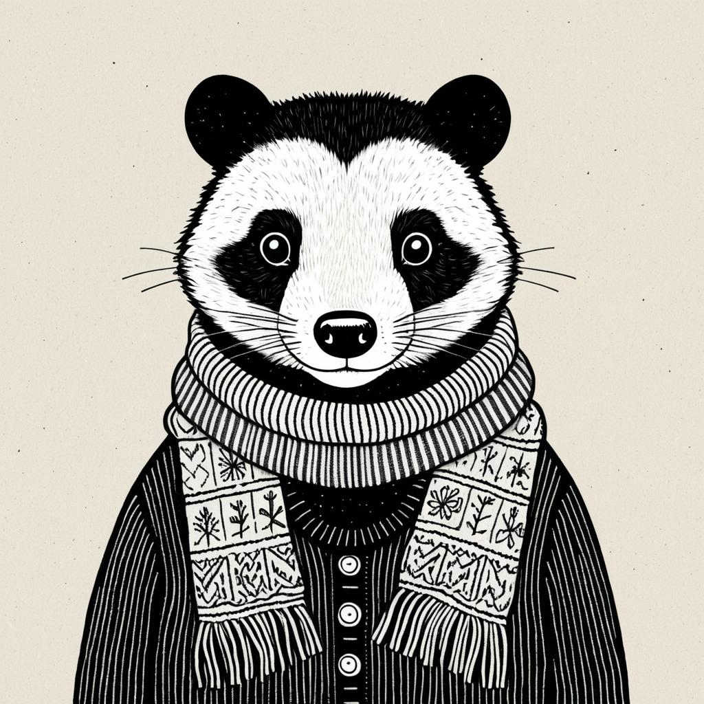 Black and white line art illustration of a badger wearing a knitted scarf and a beanie. The artwork features detailed, textured patterns on the scarf and jacket, created in a minimalist and whimsical style inspired by Gemma Correll.