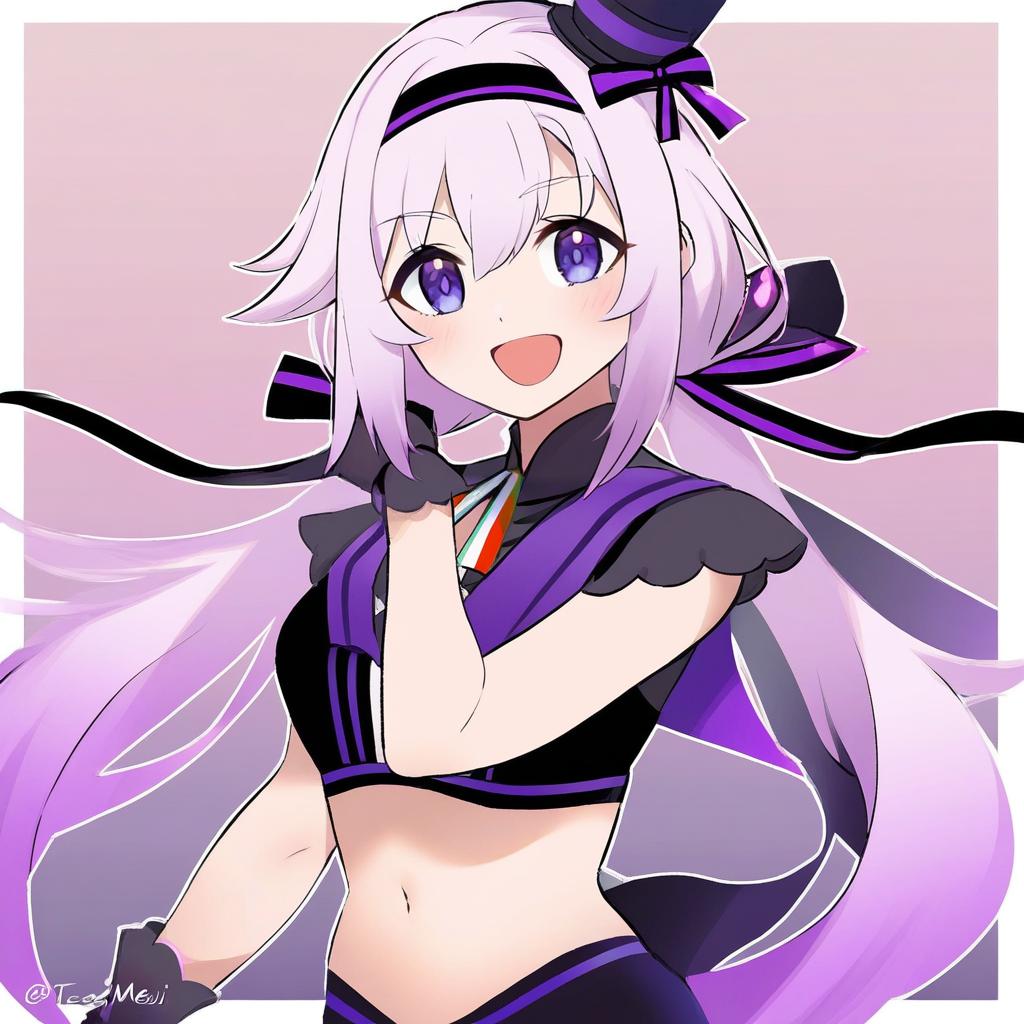 Carro pino, .live, 1girl, purple eyes, hair between eyes, purple hair, long hair, low twintails, small breasts, navel, virtual youtuber, virtual youtuber, headband, by artist meiji ken, leet