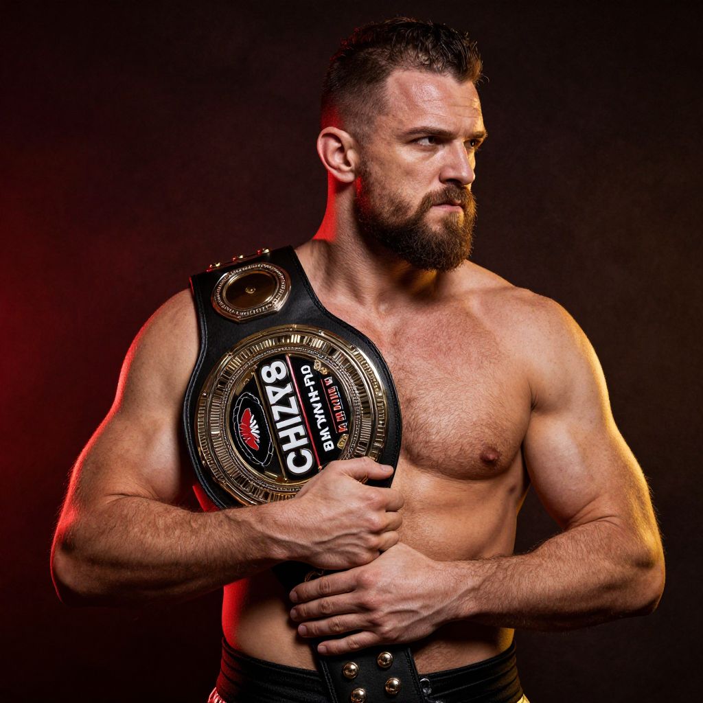 This is a highly stylized, dramatic illustration of a muscular, shirtless man with a rugged, athletic build and a thick beard, set against a dark, textured background with red and gold lighting effects, The man is positioned slightly off-center, looking to the right with a fierce, determined expression, He is holding a large, gleaming black championship belt that says: \"BUZZ CHAMP\", he holds it over his chest with both hands, his biceps are flexed prominently