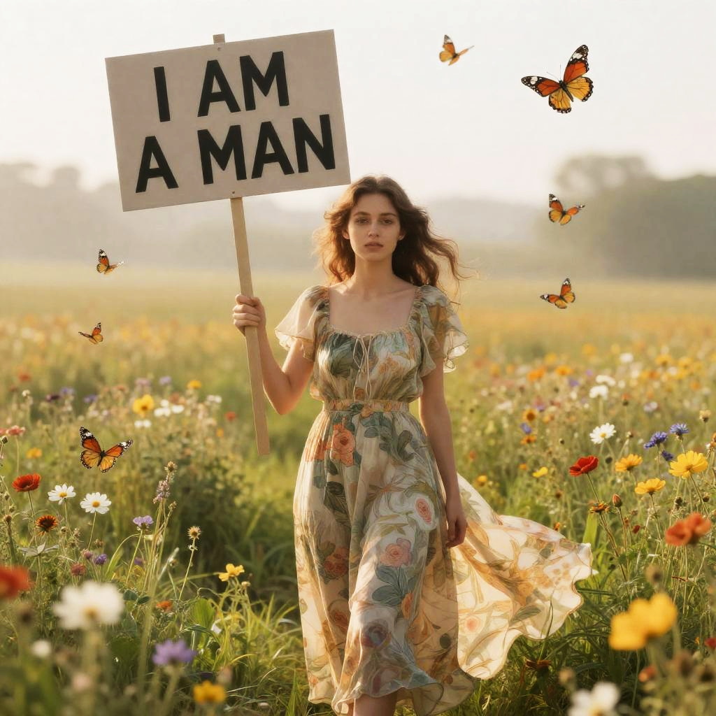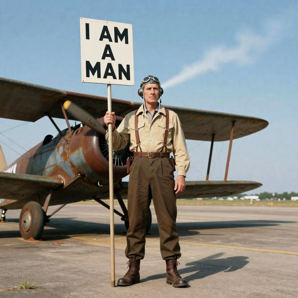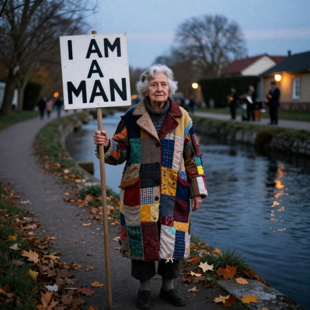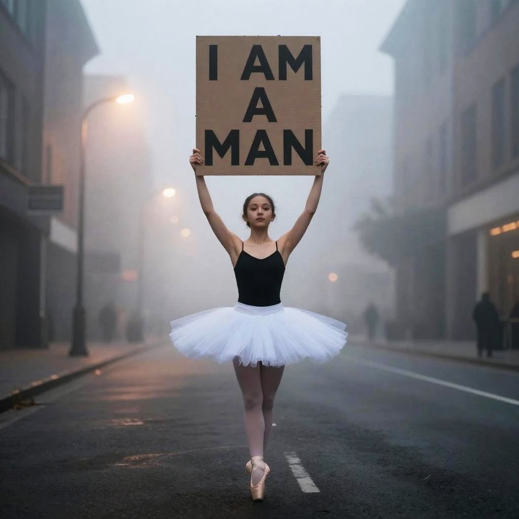 A young ballet dancer stands resolutely amidst a misty urban street at dawn, holding a picket sign that boldly states 'I AM A MAN.' The scene is filled with swirling fog and glimmering streetlights, all captured in the evocative style of Tamara de Lempicka, rendered in stunning 8k detail.