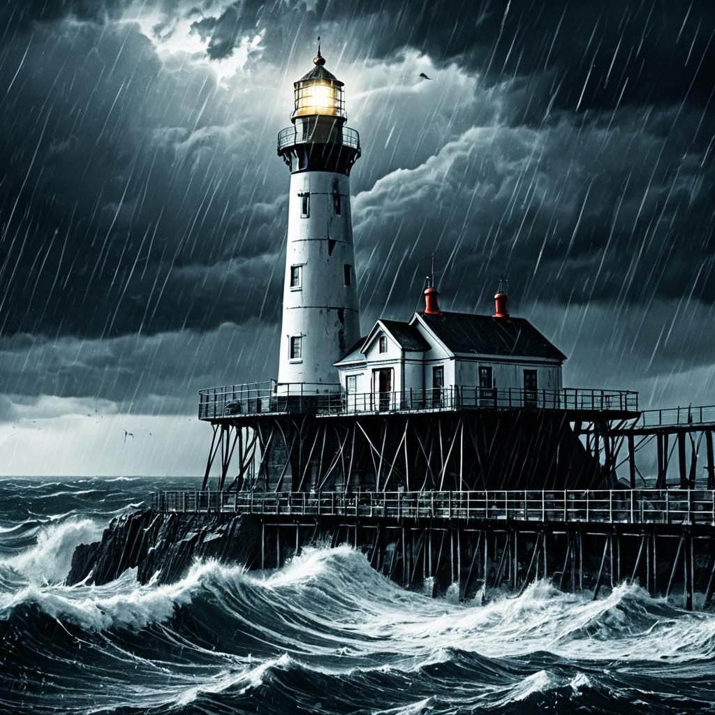 Storyboard sketches of a luminous hight-tech lighthouse overlooking stormy seas,detailed metal structures,HDR,concept art