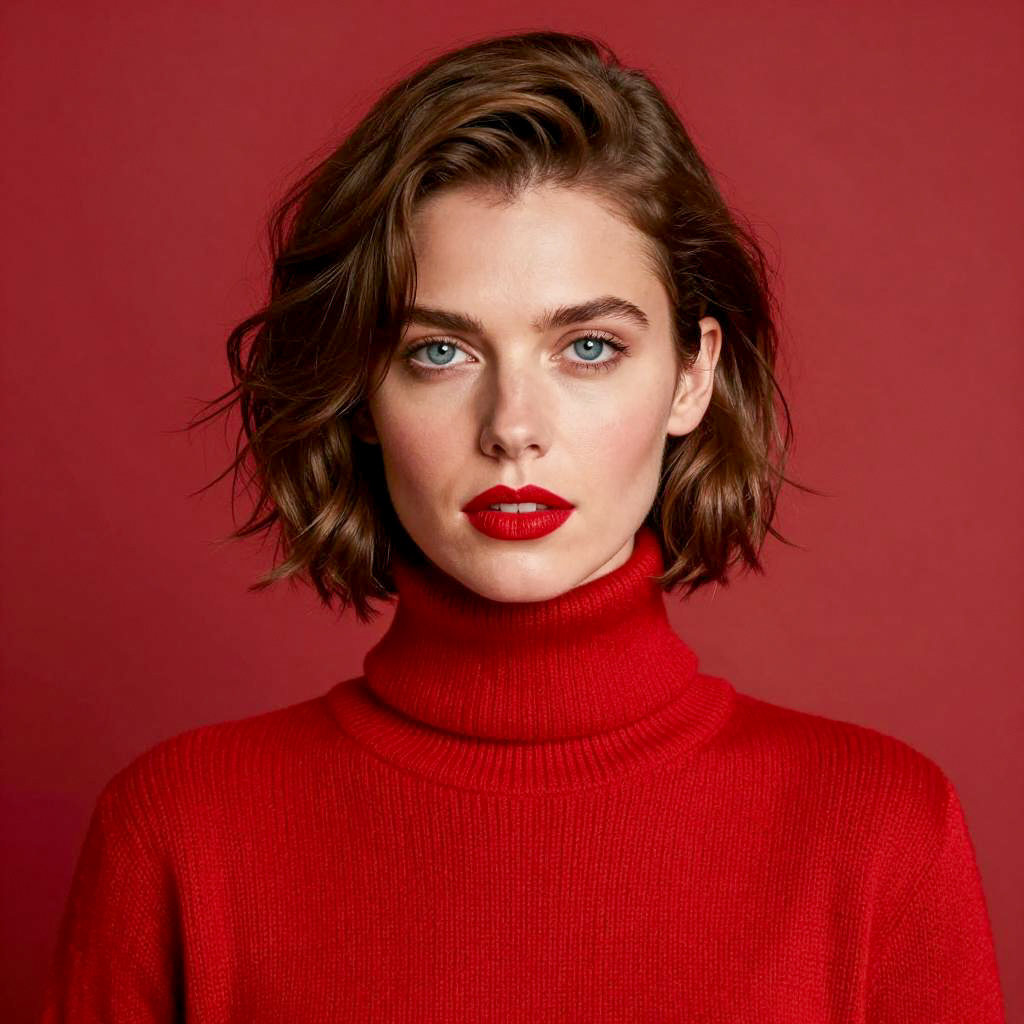 Close-up photograph of a woman with fair skin, blue eyes, and full red lips. She has wavy brown hair, slightly messy, and is looking slightly upwards. Her eyelids have shimmering silver eyeshadow. She wears a black top with a white collar. The background is a solid teal color. The lighting highlights her facial features and lips.