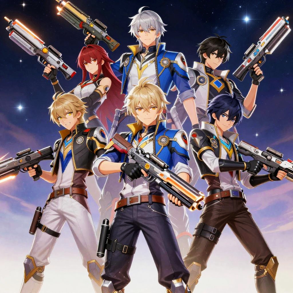 Digital anime artwork of five gun-wielding characters in blue and white uniforms, standing in a heroic pose against a starry sky.