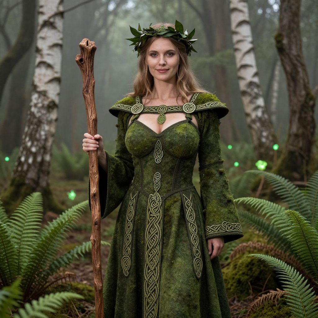 A tall, elegant woman with fair skin, sharp cheekbones, and a peaceful smile dons a hand-crafted Celtic druidess costume made of mossy green fabric, adorned with Celtic knots, a wooden staff, and a leaf crown, standing in a misty, ancient forest filled with tall birches and enchanted ferns, surrounded by soft bioluminescent plants, natural lighting, hyper-realistic photo capture. The woman has big tits and cute face