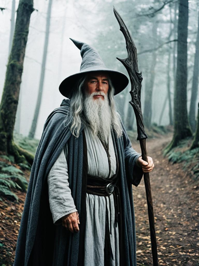 Man in Gandalf costume, outdoor portrait in misty forest setting