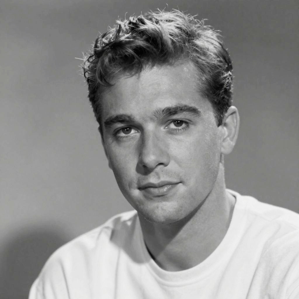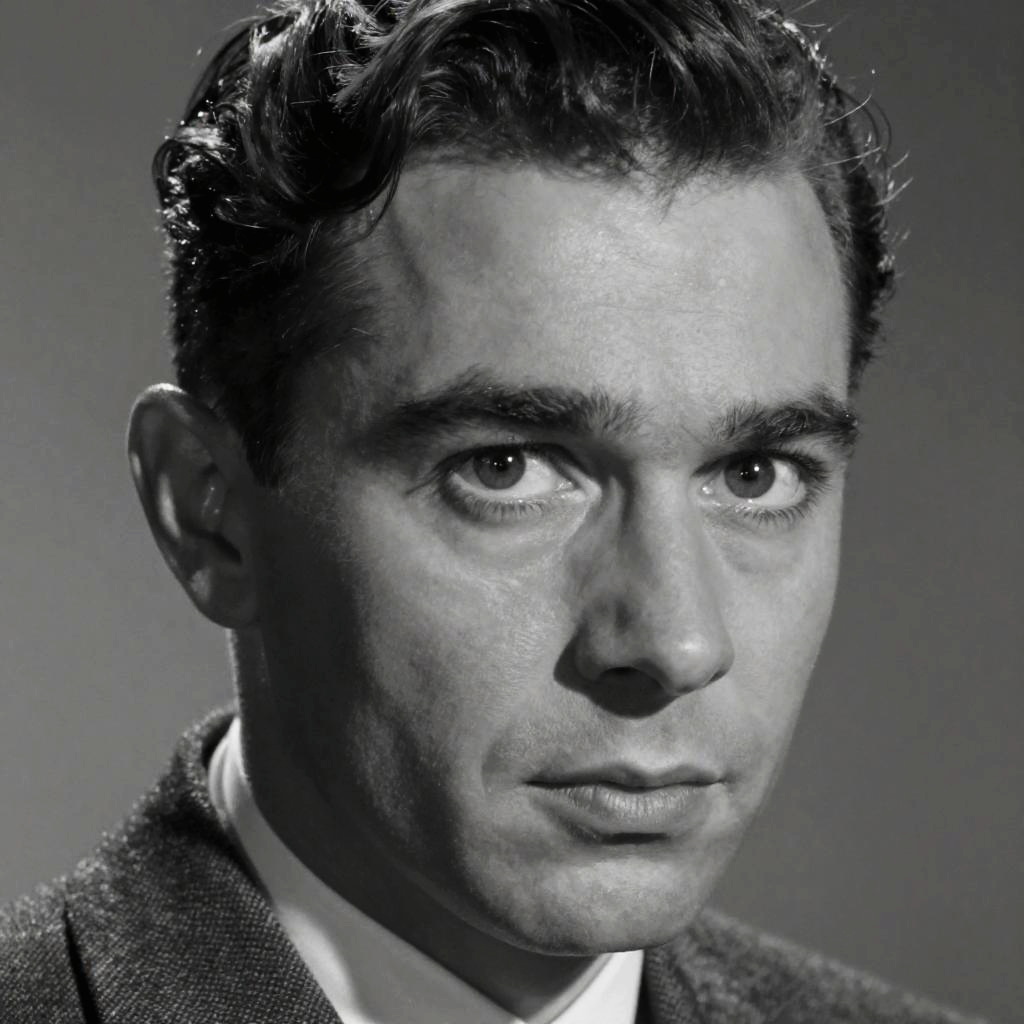 Vintage-style black and white photo of a man with perky eyes, intense gaze, classic 1940s fashion, grainy texture, dramatic shadows and highlights, cinematic mood